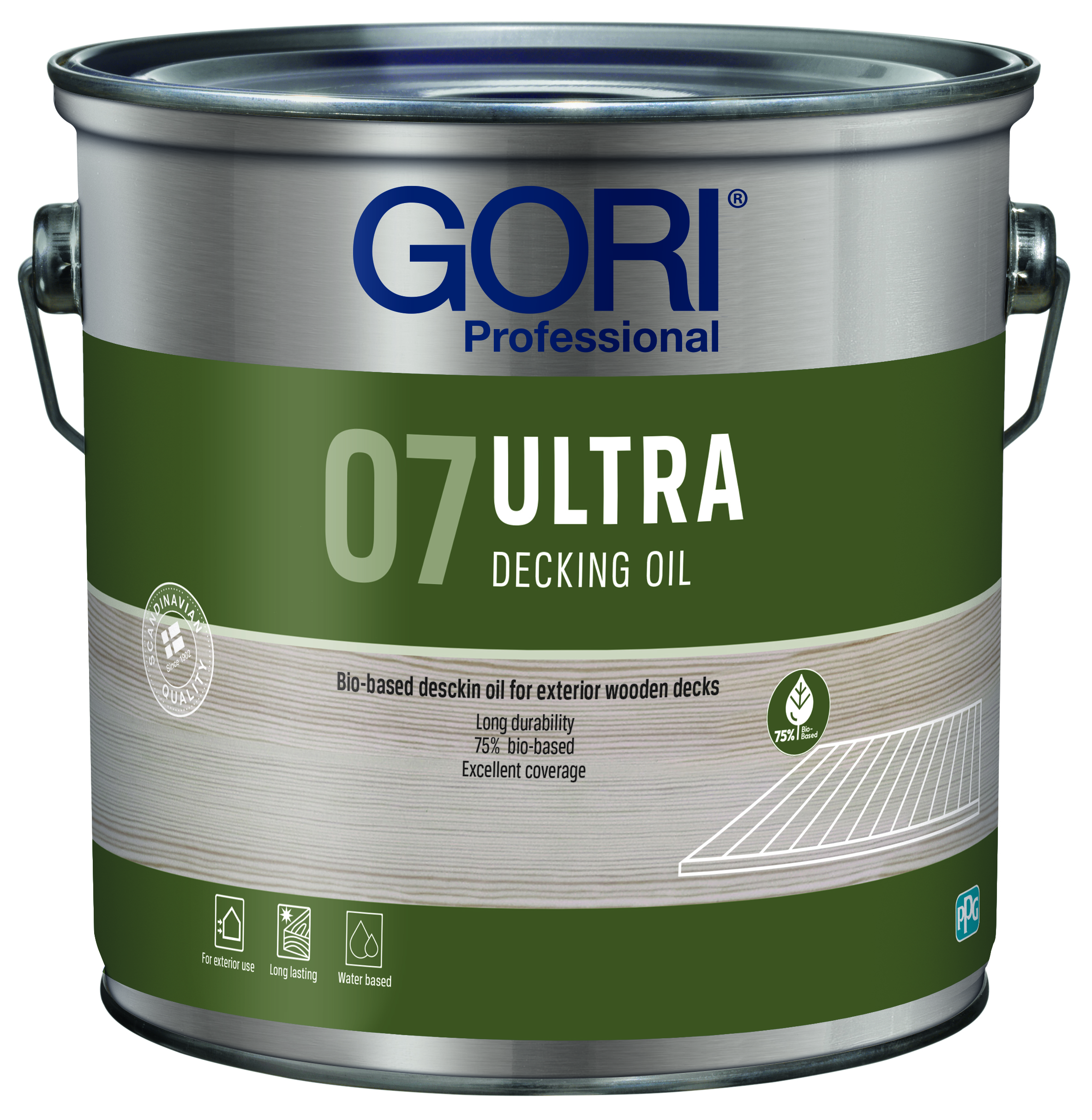 GORI 07 ULTRA Decking Oil is a partly bio-based*, long lasting decking oil with strong UV-protection for wooden decks. The product also protects against moisture, dirt, and cracking. *Bio-based content: 75% share of organic carbon measured according to ASTM D6866-18.