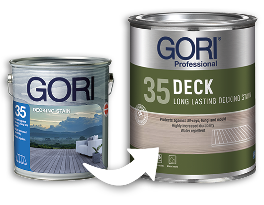 GORI 35 DECK is a translucent, water based, long lasting decking stain for exterior wooden decks and stairs. It is decorative and enhances the structure of the wood, but more importantly, it provides weather- and UV-protection for the surface. GORI 35 also slows down growth of blue stain and mould.