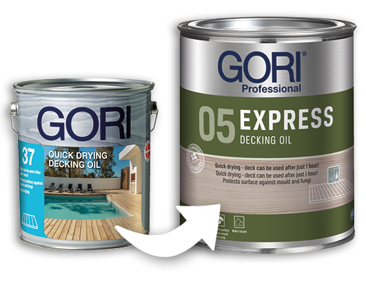 GORI 37 EXPRESS+ Decking Oil for outdoor wooden decks is a special, water based oil for outdoor wooden decks. GORI 37 stains and preserves your wooden deck and protects the surface against mould and fungi. The deck can be used just 1 hour after treatment! At least double durability compared to conventional decking oils.
