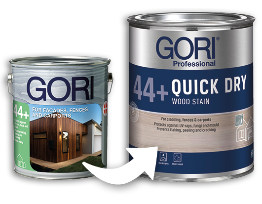 GORI 44+ QUICK DRY wood stain for cladding, fences and carports is an alkyd modified, water based, translucent wood protection, which prevents surface fungi and mould. Protects against the sun’s UV-rays.