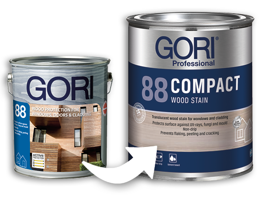 GORI 88 COMPACT wood stain for windows. doors and cladding is a satin finish, translucent, solvent based wood stain with surface fungicide properties. GORI 88 is based on alkyd resins. Very easy to apply due to its thixotropic formulation (minimizes tendency to drip).